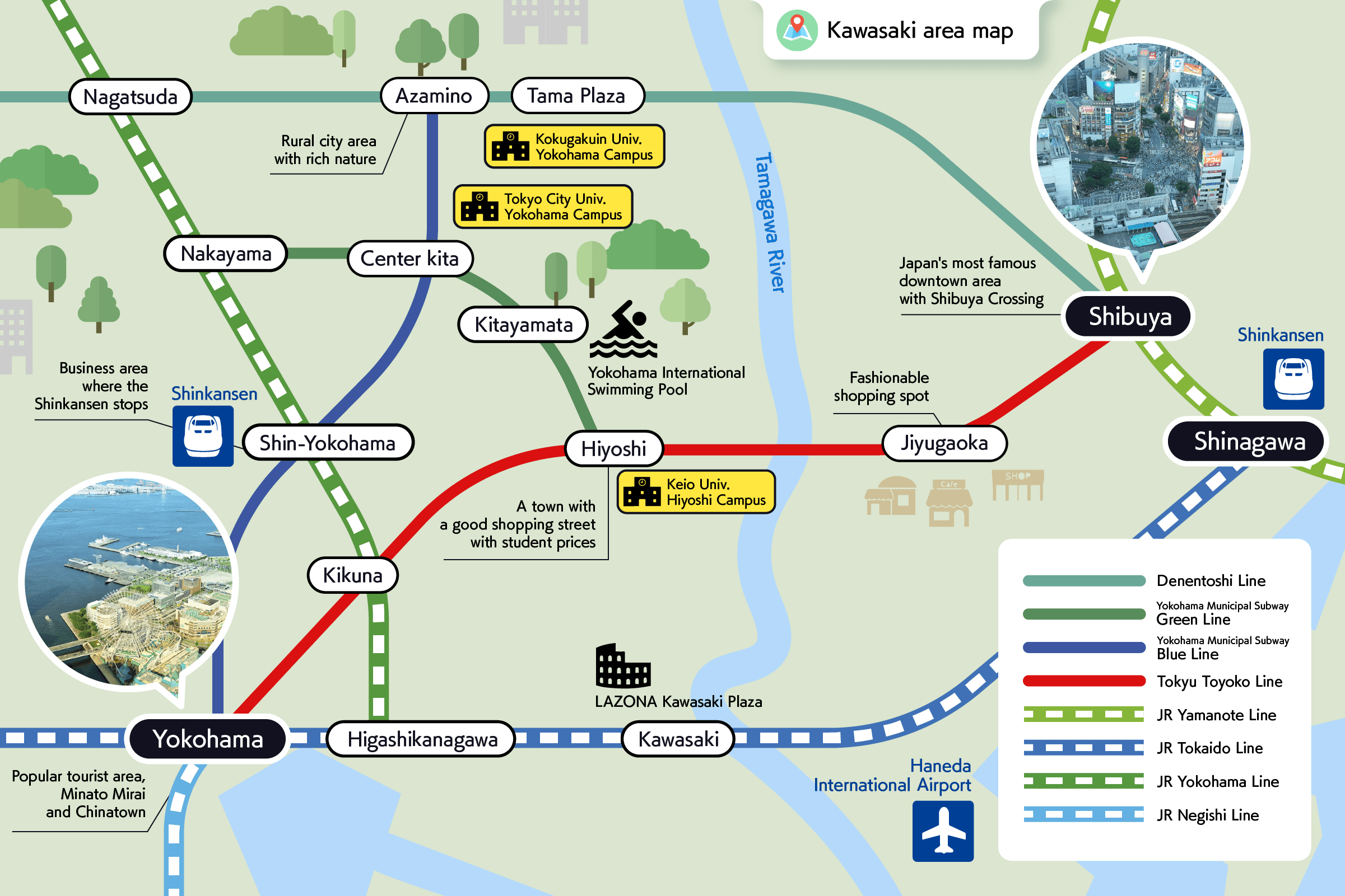 There is also "Yokohama municipal subway green line which Yokohama City Transportation Bureau runs. You can get to Shin-Yokohama Station where the Shinkansen stops if you change to the blue line of the same subway at Center Kita or Minami Station. It is a good location to commute to the center of Tokyo, and go shopping and take relax on holidays.
